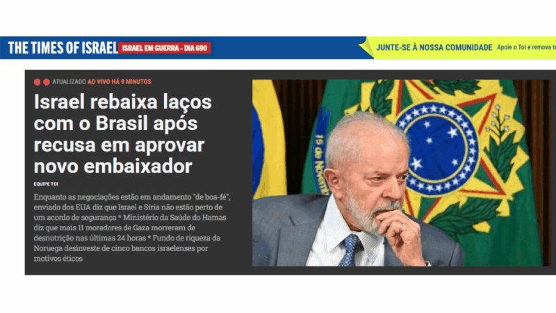 25 de agosto de 2025 20:48O Ministério das Relações Exteriores de Israel anunciou nesta segunda-feira (25) que vai “rebaixar” as relações com o Brasil após o Itamaraty ter ignorado a indicação de um novo embaixador. Israel havia indicado o diplomata Gali Dagan em janeiro para assumir a embaixada em Brasília. Para exercer a atividade, no entanto, é necessária a concessão de uma autorização do país que o recebe, chamada de “agrément”. Tal autorização é praxe em todas as relações entre países. As informações são do jornal “The Times of Israel”.
