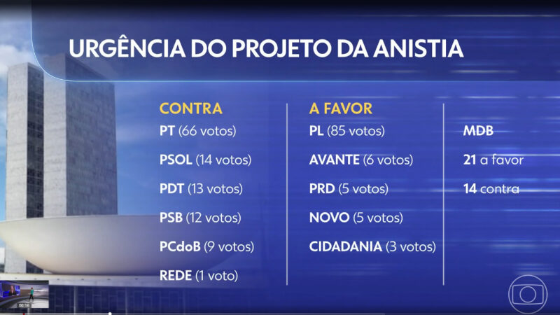 O PL de Bolsonaro entregou 85 votos favoráveis, com todos os seus deputados presentes votando ‘sim’. O apoio foi quase unânime no Republicanos, com 40 dos 41 deputados votando a favor, e no PP, que registrou 43 votos pela urgência e apenas 6 contrários.
