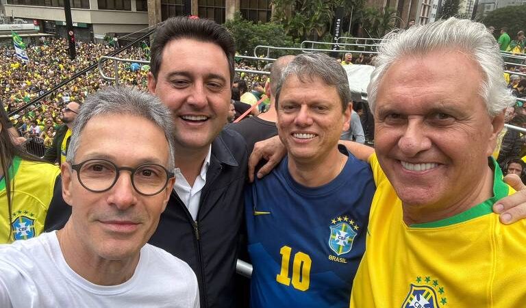 - A tropa da direita em tempos felizes: à esquerda, Romeu Zema (Novo), com os governadores do Paraná, Ratinho Jr. (PSD), Tarcísio de Freitas (Republicanos) e de Goiás, Ronaldo Caiado (União Brasil). Reprodução/X