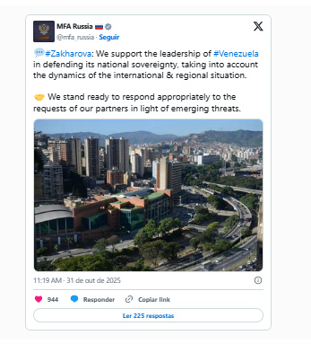 31 de outubro de 2025 15:42O governo do presidente russo, Vladimir Putin, anunciou nesta sexta-feira, 31, o que já estava óbvio nos bastidores, mas que era funfamental deixar explícito: a Rússia apoia incondicionalmente a Venezuela contra possíveis – e aparentemente iminentes, diante do cerco no Caribe – ataques das forças militares dos Estados Unidos a embarcações supostamente envolvidas no tráfico internacional de drogas.