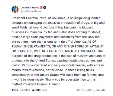No domingo (19), Trump retirou uma ajuda financeira de seu país à Colômbia sob o argumento de que o governo colombiano está fomentando a produção de drogas. Em uma publicação, o norte-americano chamou Petro de “traficante de drogas”.