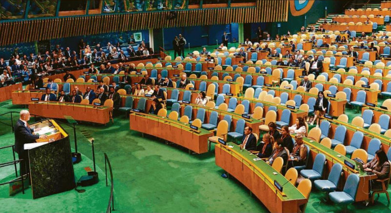 - Netanyahu fala diante de plateia vazia em boicote à guerra em Gaza. E leva tanta vaia que o pleno da ONU teve que pedir “ordem”. Foto: Angela Weiss/AFP