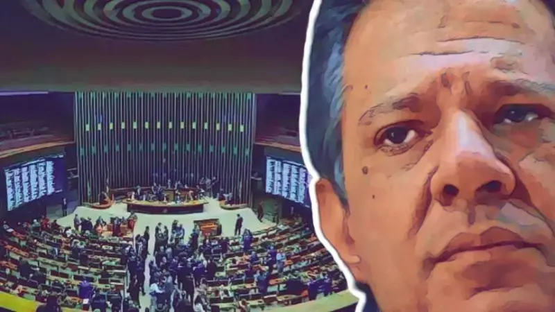 - Ministro da Fazenda, Fernando Haddad e, ao fundo o Congresso/Arte em cima de foto de Diogo Zacarias/MF/Reprodução