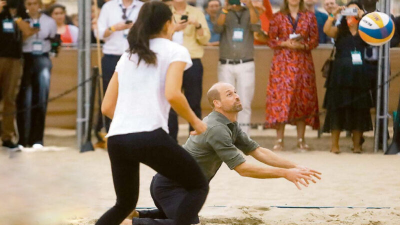 Na sequência, o príncipe aproveitou o fim de tarde com temperatura agradável para visitar mais uma paisagem icônica em sua primeira visita ao Rio. Agora de tênis branco e camisa social dobrada até o cotovelo, ele circulou por uma área gradeada – atrás da estátua de Ayrton Senna, no Posto 2 – onde acompanhou a simulação de um resgate, com direito a apitar para os bombeiros que se fingiam de afogados. No fim, ficou descalço para disputar uma partida de vôlei de praia com Carol Solberg, atleta da modalidade. Ele se jogou na areia, sacou e bloqueou – e demonstrou mais aptidão do que com o futebol.