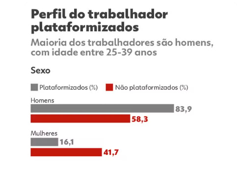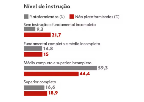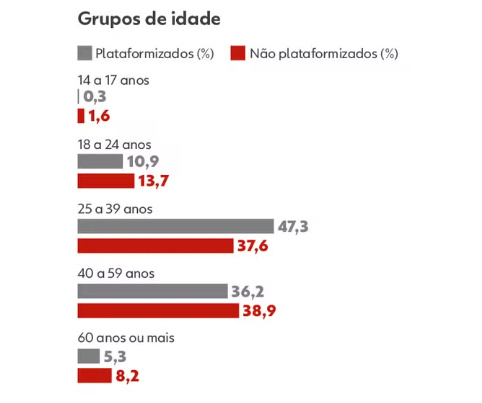 A informalidade é um traço marcante: 71,1% não têm registro, contra 43,8% dos trabalhadores tradicionais. Apenas 35,9% contribuem para a previdência, proporção bem abaixo dos 61,9% entre os demais.