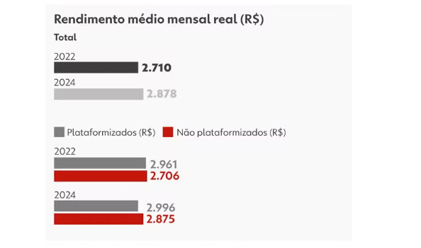 No caso dos motociclistas, 1,1 milhão estavam empregados, sendo 33,5% em aplicativos. O rendimento médio dos plataformizados foi de R$ 2.119, acima dos não plataformizados (R$ 1.653), mas com maior carga horária e informalidade.