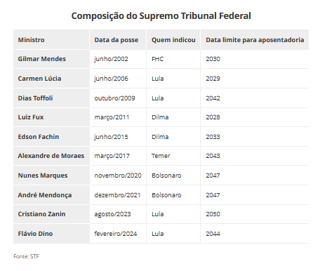 O plenário do STF é formado por 11 ministros. A tabela abaixo mostra o ano em que cada um tomou posse, quem os indicou e a data limite para aposentadoria compulsória (aos 75 anos).