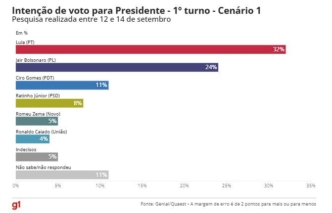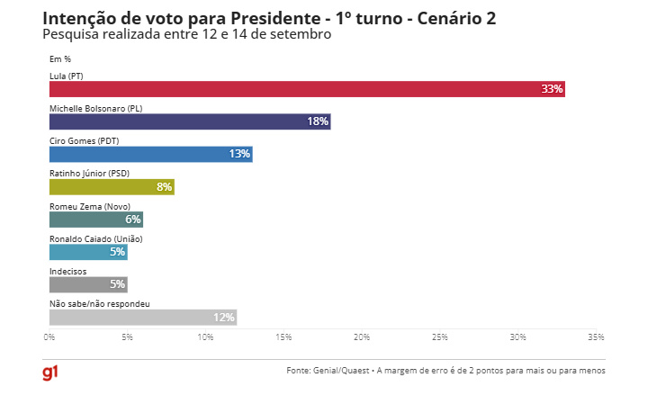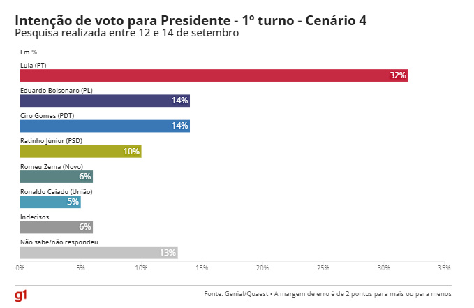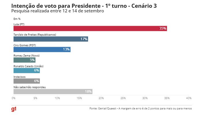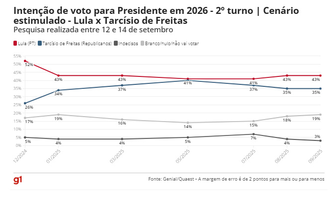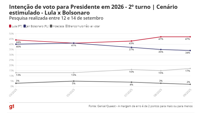 A pesquisa Quaest foi encomendada pela Genial Investimentos e realizada entre os dias 12 e 14 de setembro e ouviu 2.004 pessoas com 16 anos ou mais. A margem de erro é de dois pontos percentuais, para mais ou para menos, e o nível de confiança é de 95%.