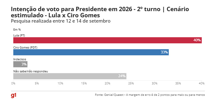 Testado pela primeira vez em cenário de 2º turno pela Quaest, Ciro, ex-governador do Ceará, aparece sete pontos atrás de Lula, com 33% das intenções de voto contra 40% do presidente.