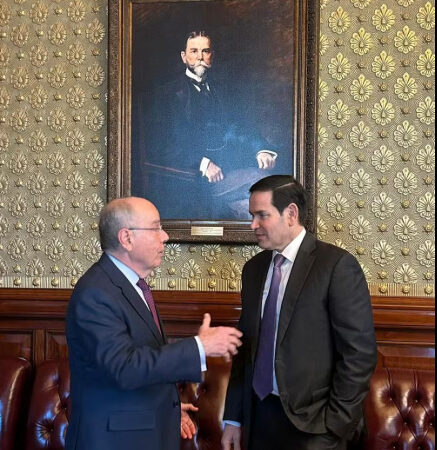 - Na foto, mão no ar: Mauro Vieira e Marco Rubio se encontraram em Washington. O chanceler disse ainda que “durante todo o encontro, prevaleceu uma atitude construtiva, voltada aos pontos da retomada das negociações entre os dois países, em sintonia e com boa química”. Podem traduzir? Foto: Embaixada do Brasil