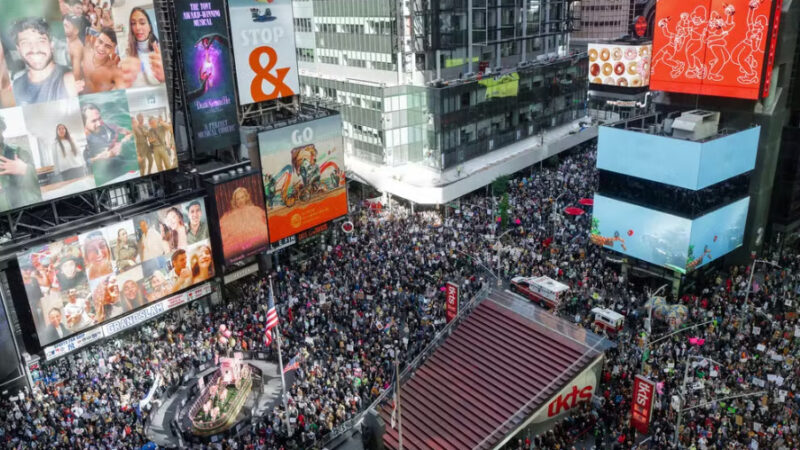 - Milhares de manifestantes ocupam a Times Square durante o protesto “No Kings”, no sábado, 18, em Nova York.As manifestações pipocaram pelos EUA e Europa. Foto: Olga Fedorova/AP