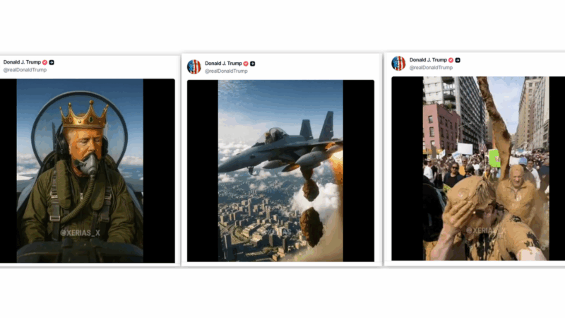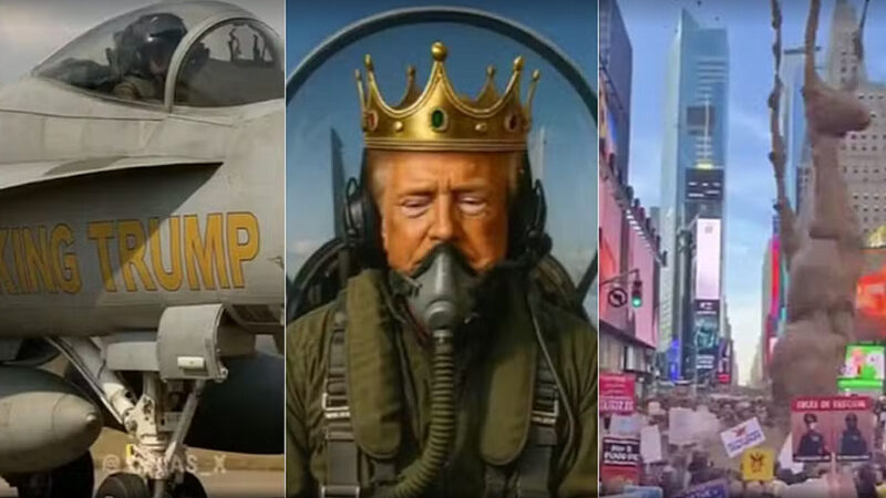 Voando e cagando: Trump publica vídeo de IA em que usa coroa e, pilotando jato, despeja merda sobre manifestantes do ‘No Kings’