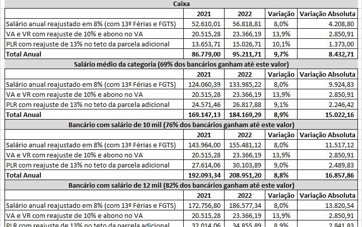 31 de agosto de 2022 15:42Após dois meses e meio de duras negociações, o Comando Nacional dos Bancários arrancou da Federação Nacional dos Bancos (Fenaban) uma proposta para 2022 e 2023. Para este ano, a categoria terá reajuste de 8% nos salários, aumento de 10% nos vales alimentação (VA) e refeição (VR), além de um adicional de R$ 1.000,00 em vale alimentação, a ser creditado até outubro de 2022. A proposta também prevê reajuste de 13% para a parcela adicional da Participação nos Lucros e Resultados (PLR) neste ano e, para 2023, aumento real de 0,5% (INPC + 0,5%) para salários, PLR, VA/VR e demais cláusulas econômicas.