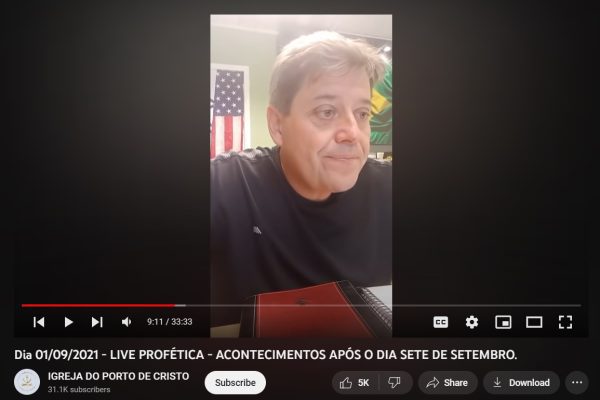 10 de março de 2023 10:18O pastor Sandro Rocha, líder da Igreja do Porto de Cristo, com sede no município catarinense de São João Batista, a 70 quilômetros de Florianópolis, é um evangélico diferenciado. Enquanto supostamente prega a palavra de Cristo em suas lives no Youtube, mantém no cenário itens como fardas militares e a bandeira dos Estados Unidos.