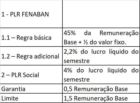 Já a PLR Social, conquista dos empregados desde 2010, equivale a 4% do lucro líquido do exercício distribuídos de forma linear entre os trabalhadores. Além dessas regras, a soma da regra Fenaban com a PLR Social não pode ser inferior a uma remuneração base nem superior a três remunerações base.