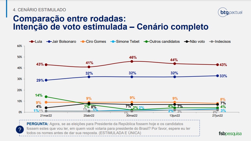 Encomendado pelo banco BTG Pactual, o levantamento entrevistou 2 mil eleitores por telefone entre os dias 24 e 26 de junho. A margem de erro é de 2 pontos percentuais, com intervalo de confiança de 95%.