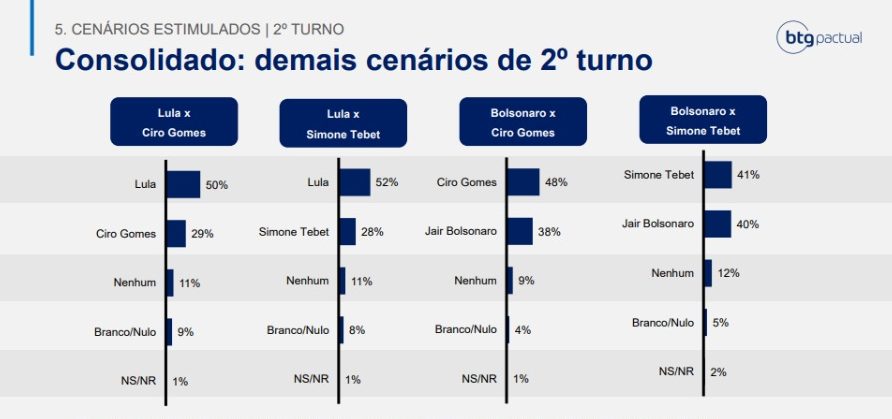 No confronto direto com Ciro Gomes (PDT), o atual presidente teria 38% contra 48% do pedetista. Já na disputa com Tebet, Bolsonaro ficaria com 40% e a emedebista somaria 41%. Embora numericamente à frente, há um empate técnico.