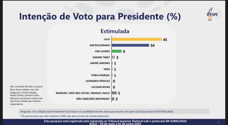 Pesquisa Ipespe: Lula tem 45% contra 34% de Bolsonaro; vantagem no 2º turno é de 18 pontos para o petista