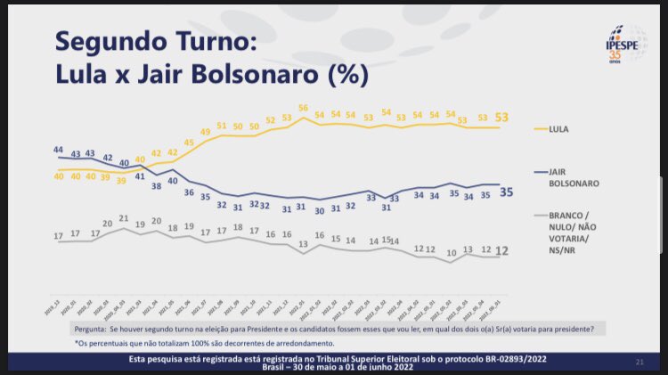 Na projeção de segundo turno entre Lula e Bolsonaro, o petista aparece com 53% das intenções de voto e o atual chefe do governo com 35%.