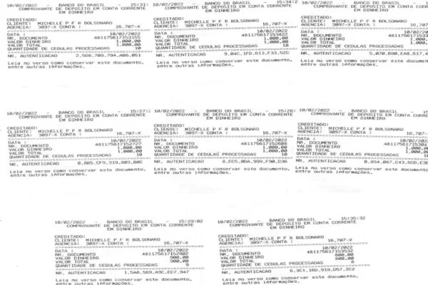 Em 11 de agosto, Michelle recebeu R$ 6 mil, num total de quatro depósitos. Já em 19 de agosto, a ex-primeira-dama recebeu dois depósitos no valor de R$ 1 mil, somando R$ 2 mil. O último depósito aconteceu em 11 de dezembro, quando ela recebeu o total de R$ 7 mil, com dois depósitos de R$ 2 mil, um de R$ 1,1 mil e mais um de R$ 1,9 mil.