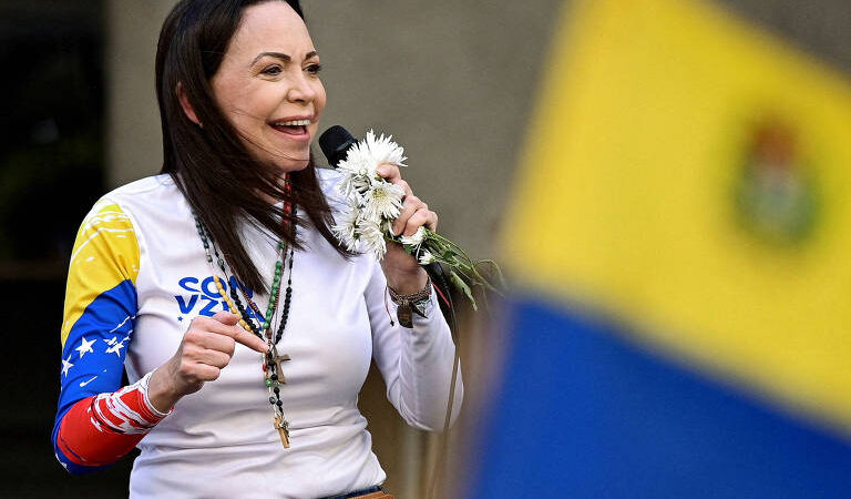 - María Corina Machado participa de ato da oposição em Caracas, em janeiro de 2025, um dia antes da posse de Nicolás Maduro para novo mandato; esta foi a última vez em que ela foi vista em público. Foto: Gaby Oraa/Reuters