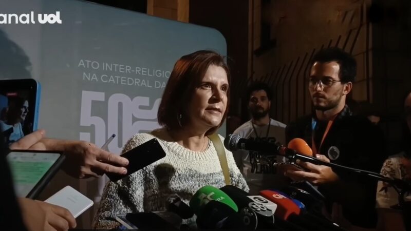 26 de outubro de 2025 09:16Cinquenta anos após o assassinato do jornalista Vladimir Herzog, em culto interreligioso na Catedral da Sé em sua homenagem, na presença de nomes simbólicos ds esquerda brasileira, todos de branco, a presidente do Superior Tribunal Militar, Maria Elizabeth Rocha – a primeira mulher a presidir a Justiça Militar sa União -, pediu perdão aos mortos, desaparecidos e torturados do regime militar, estendendo o gesto aos familiares. O ato é histórico. “Não podemos permitir que a ditadura retorne, nem como farsa, nem como tragédia”, disse. Todos se levantaram e a aplaudiram de pé.