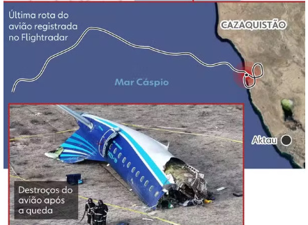 - Avião fabricado pela Embraer que caiu no Cazaquistão no dia 25 de dezembro de 2024. O presidente russo admitiu que foi derrubado pelas defesas russas, prometeu indenização aos afetados e – ah, gente… – pediu desculpas. — Foto: Azamat Sarsenbayev/Reuters